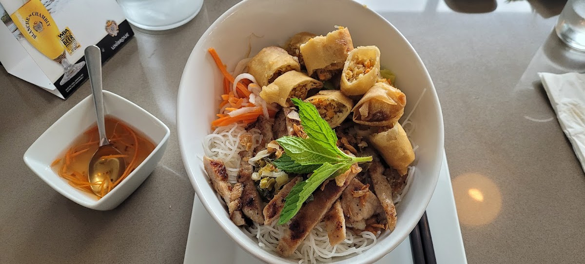 Today's lunch was bun bo Hue and salad rolls. I'm lucky I could drop by this restaurant on my way home. It means I can enjoy delicious Vietnamese food whenever I want. The moment I got into the restaurant, I felt a cozy and very clean atmosphere. The owner's service was friendly and fast. The noodle soup was enough to taste traditional Vietnamese food, and the salad rolls were spot on. It is worth a visit, and I plan to visit again to try a vermicelli bowl and banh mi.